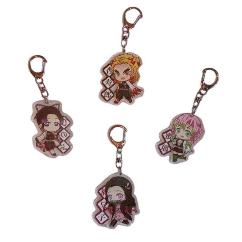 Llaveros de metacrilato de Kimetsu no Yaiba. Incluyen diseños de Rengoku, Nezuko, Shinobu y Mitsuri, personajes emblemáticos de la serie.