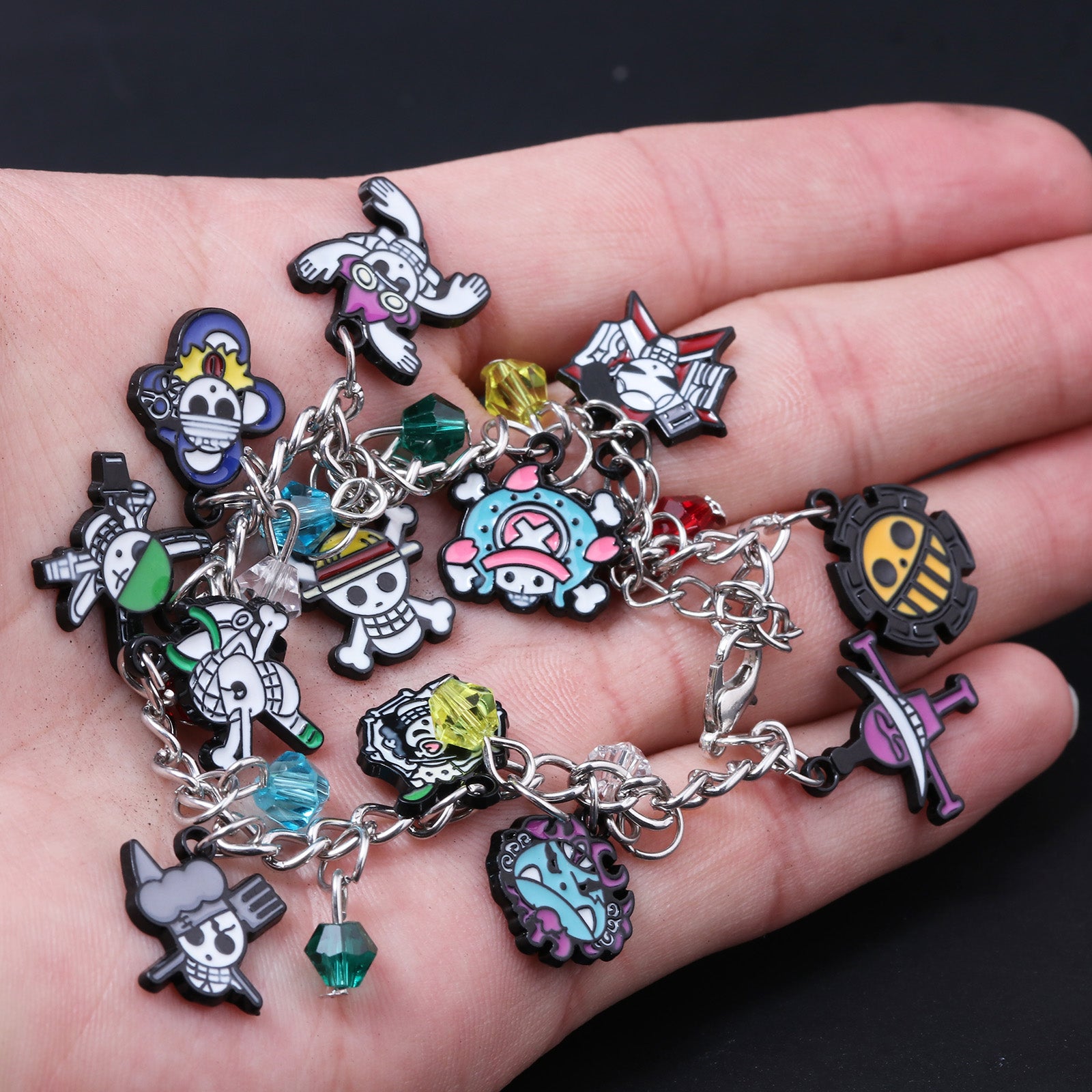 Una pulsera caótica y llena de carácter, inspirada en los piratas de One Piece. La cadena de eslabones sostiene distintos dijes en forma de calaveras, símbolos icónicos que representan a los personajes más temidos (y queridos) del anime.